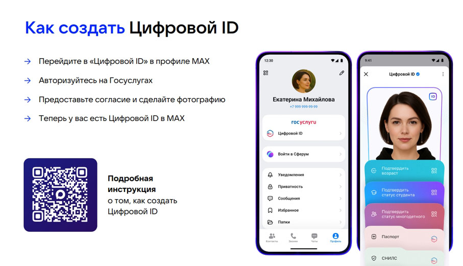 Как создать Цифровой ID: 1. Перейдите в Цифровой ID в мессенджере MAX. 2. Авторизуйтесь на Госуслугах. 3. Предоставьте согласие и сделайте фотографию. 4. Теперь у вас есть Цифровой ID в MAX.