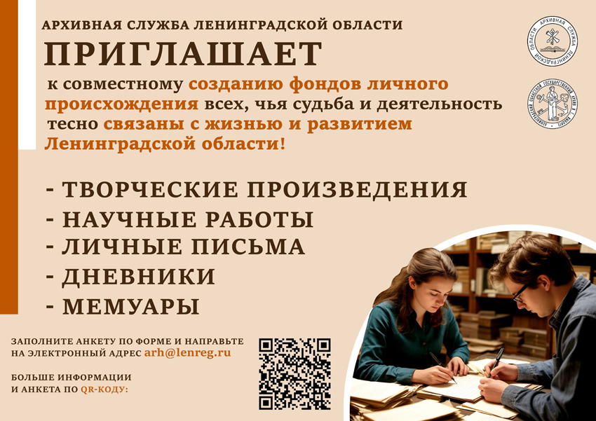 Архивное управление Ленинградской области и Ленинградский областной государственный архив в г. Выборге приглашают к совместной работе по созданию фондов личного происхождения всех, чья судьба и деятельность тесно связаны с жизнью, развитием и достижениями Ленинградской области, а также тех, кто работал на благо России в разных ее уголках и сегодня проживает в нашем регионе. Мы хотим вместе с вами сохранить документальную историю людей, которые трудились в разных отраслях экономики, создавая великую историю нашей Родины, запечатлеть роль, как известных, так и простых людей в этой работе, а также попытаться сохранить восприятие исторических событий и фактов глазами современников, сохранить историю трудовых династий и семей с традициями нашего региона.